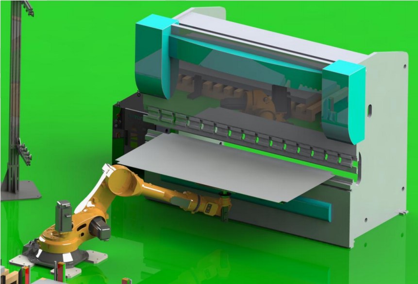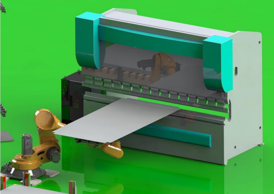 定位后,机器人取料到折弯机处折弯,折弯两边的翻边特征→